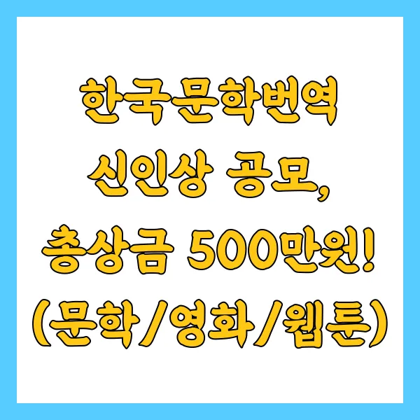 한국문학, 영화, 웹툰 번역 신인을 찾습니다! K-콘텐츠의 세계적인 인기 속에 숨겨진 당신의 재능을 펼칠 기회! 총 500만원의 상금과 해외 진출 지원 혜택까지! 지금 바로 한국문학번역 신인상에 도전하세요! 문학, 영화, 웹툰 각 부문별 자세한 사항을 확인하고 꿈을 현실로 만들어보세요! #한국문학번역 #번역공모전 #신인상 #K콘텐츠 #웹툰번역 #영화번역 #문학번역 #500만원