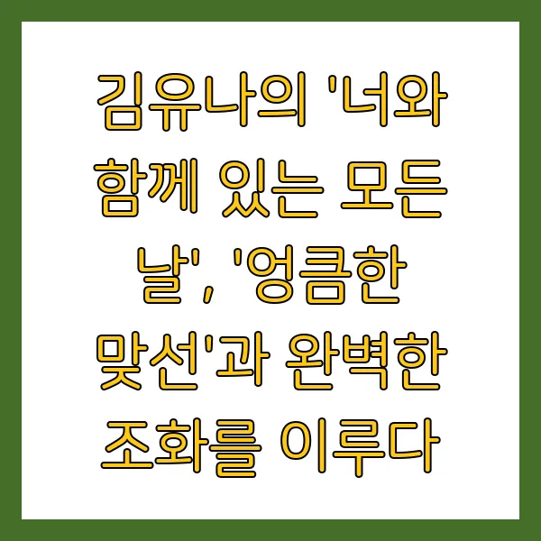 김유나의 '너와 함께 있는 모든 날'은 단순한 OST를 넘어 '엉큼한 맞선'과 완벽하게 조화를 이루는 하나의 예술 작품으로 탄생했습니다. 이 곡은 듣는 이들에게 사랑의 설렘과 따스함을 전달하며 '엉큼한 맞선'의 감동을 더욱 풍부하게 경험할 수 있도록 도와줍니다. 김유나의 섬세한 감정 표현과 뛰어난 가창력, 그리고 Jay Lee 작곡가의 탁월한 프로듀싱 능력이 만나 탄생한 '너와 함께 있는 모든 날'은 '엉큼한 맞선' 팬들은 물론 모든 음악 팬들에게 깊은 감동과 울림을 선사할 것입니다. '엉큼한 맞선'의 로맨틱한 세계관에 김유나의 감성 보컬이 더해져, 듣는 이들의 마음속에 잊지 못할 멜로디를 새겨줄 것입니다. 지금 바로 각종 음원 사이트에서 김유나의 '너와 함께 있는 모든 날'을 감상하고, '엉큼한 맞선'의 감동을 다시 한번 느껴보세요!